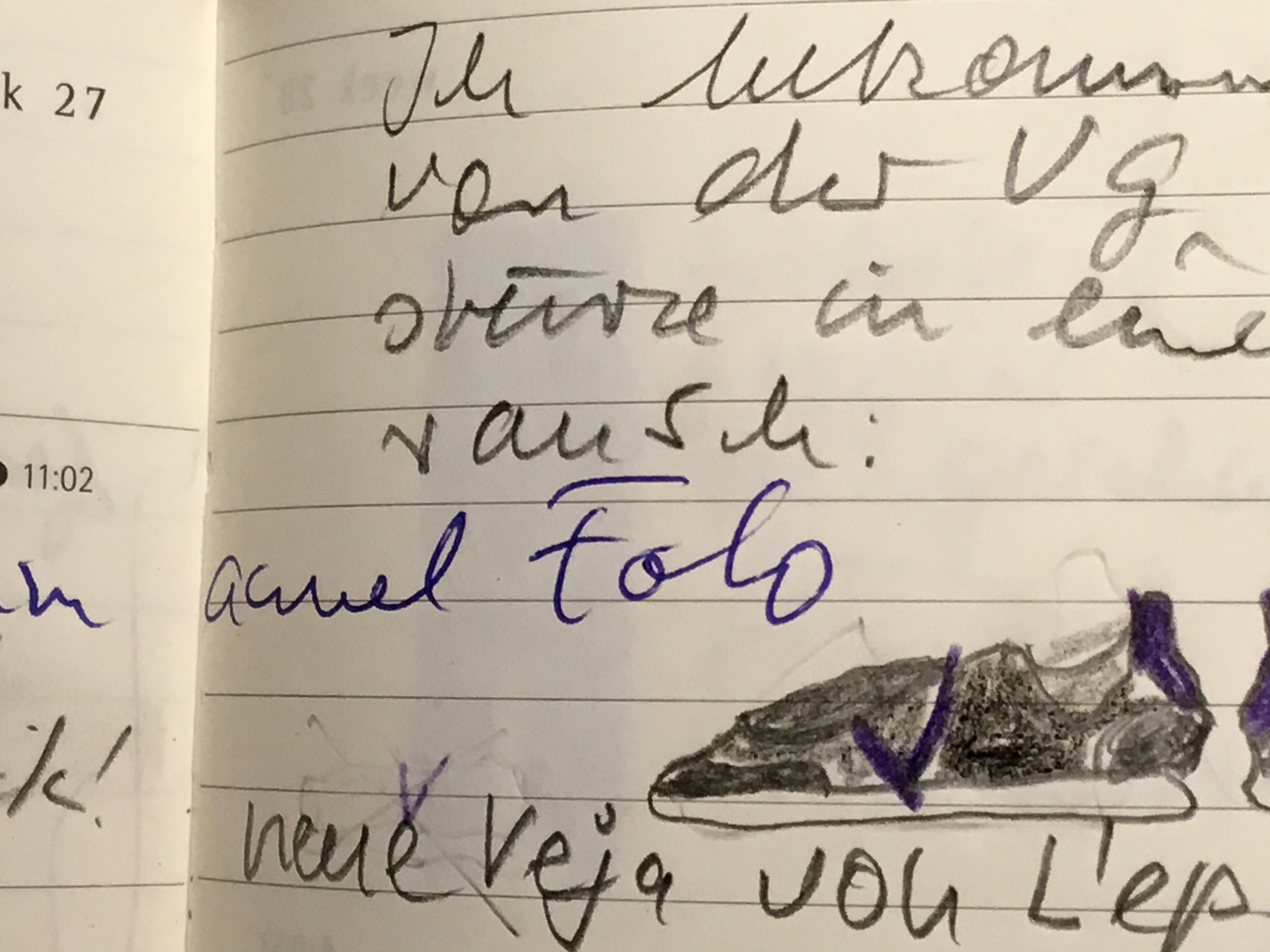 Er ist orange eingebunden und verströmt einen Geruch von Kunststoff, als ich die dünne Plastikhülle entferne. Ich öffne ihn vorsichtig, berühre die freien Seiten. Es ist, als wagte ich die ungeschriebenen Geschichten des neuen Jahres zu berühren, als greife ich der Zeit voraus. Plötzlich quillt der Lärm zukünftiger Tage aus dem Kalender. Ich schließe ihn schnell wieder mit dem Gummibändchen. Die kommenden Tage werden ihn füllen; mit Visitenkarten, Terminkärtchen, Wegbeschreibungen, Flyern, Kassenbons und Erinnerungsschnipseln. Vielleicht auch ein Foto. Eine Zeichnung irgendwo.
